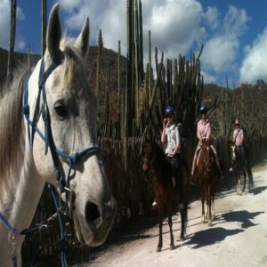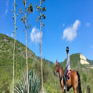 Pase la mañana explorando a caballo tierras ricas en agaves silvestres que se utilizan para hacer mezcal y cactus nativos que buscan las aves y las abejas. Impresionantes vistas panorámicas rodean el viaje de regreso al Rancho.